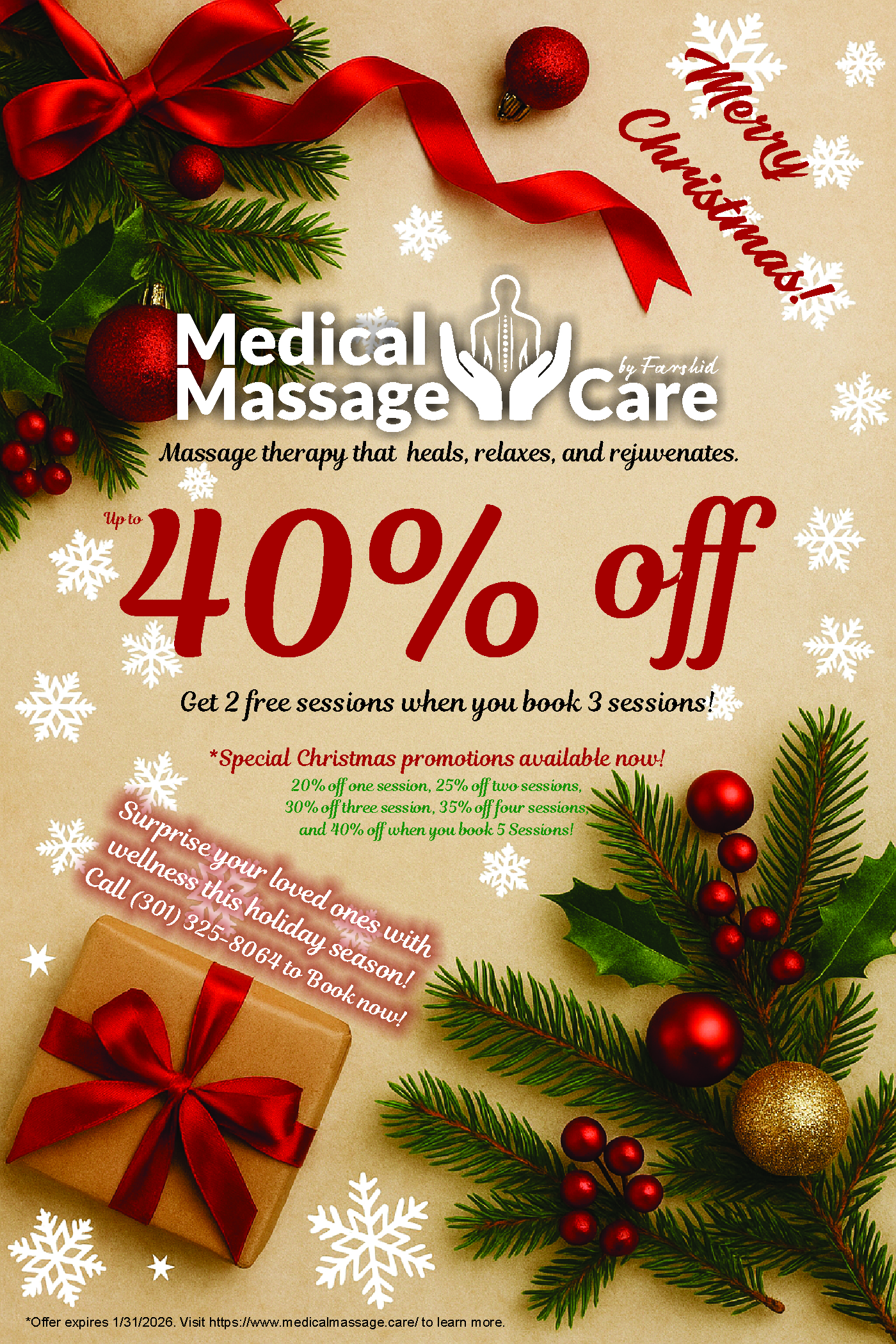 Here at { Medical Massage Care } we offer a variety of services, tailored to target and treat your specific need. From “Sports Massage” with focus on professional athlete’s muscular performance, to “Stress & Tension Release Massage” appropriate for all groups and ages, we have it all!